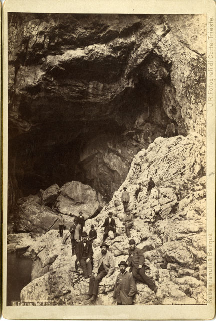Veduta panoramica della base della Grotta Noe con un gruppo di uomini in piedi lungo la sponda destra del Recca-Timavo (Timavo superiore). Tra le 17 persone ritratte in un momento di pausa della visita alle Grotte di San Canziano, si nota una delle guide (Joze Cerkvenik, il quinto da destra).