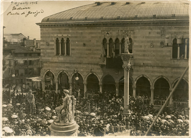 La fotografia si riferisce alla attuale piazza Libertà prima intitolata a Vittorio Emanuele II a Udine. La presa di Gorizia, avvenuta l'8 agosto 1916, fu un evento cruciale della Sesta battaglia dell'Isonzo durante la Prima Guerra Mondiale, rappresentando la prima vera vittoria per l'esercito italiano e un momento di grande impatto sul morale nazionale, sebbene non strategicamente decisiva
