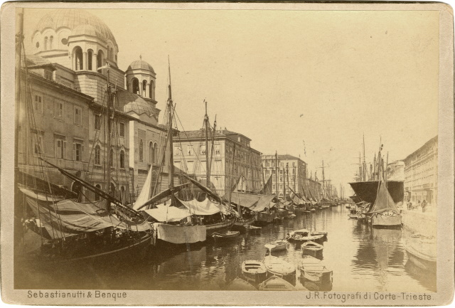 Il Canale di Ponterosso o Canal Grande, con numerosi velieri, bragozzi e barche, visto dalla chiesa di S. Antonio Nuovo. A sinistra la vecchia casa del caffe' Stella Polare, gia' Vukasovich, prima delle modifiche del 1902-1904; poi il piccolo palazzo sede della scuola serba Jovan Miletic e la Chiesa di San Spiridione della comunita' serbo-ortodossa, costruite ambedue dall'arch. milanese Maciacchini, terminate nel 1868. Segue la casa Brunner e la casa Genel, eretta nel 1873 dall'arch. Antonio Bacicchi e radicalmente modificata nell'interno nel 1928 per ospitarvi una filiale della Banca Commerciale Italiana. L'ultima costruzione e' il lungo fianco del neoclassico Palazzo Carciotti (arch. M. Pertsch, 1802-1805). Sul fondo del canale si vede il ponte "rosso", toponimo che e' passato ad indicare tutta la zona. Si noti come in origine il canale s'addentrasse in profondità fino alla chiesa di S. Antonio Nuovo, solo nel 1934 il tratto antistante la chiesa, fino alla linea delle vie S. Spiridione e Fabio Filzi, venne interrato