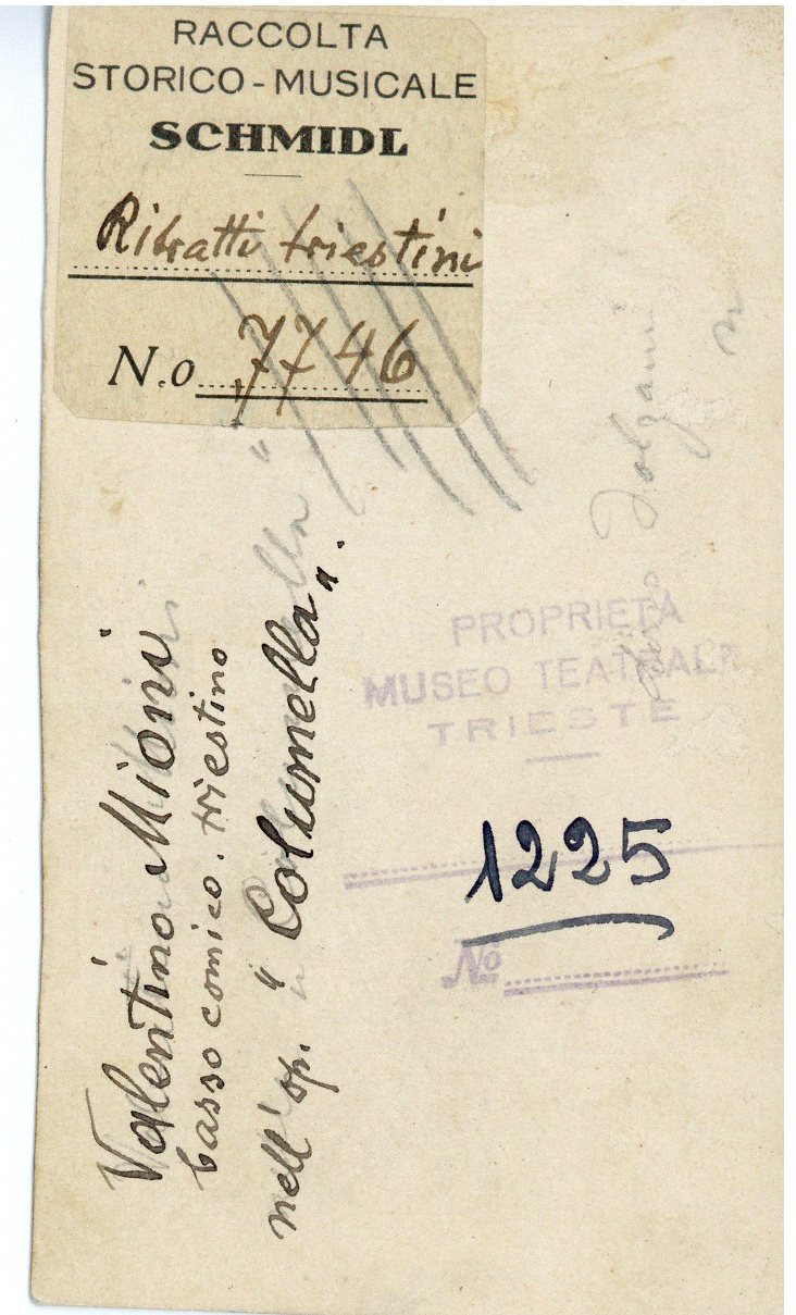 In costume in "Columbella". Allievo del m.° G. A. Scaramelli. Una locandina del Teatro Galimbeni di Vigevano riporta una serata a beneficio del basso comico assoluto Valentino Mioni il giovedì 10 febbraio 1870 ( in rassegna stampa triestini)