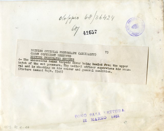 La "torpedine umana" viene estratta inconscia dell'apparecchio a pressione liquida mentre l'ufficiale medico studia le condizioni generali del soggetto