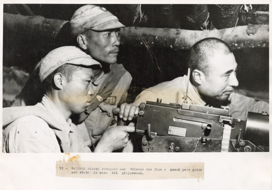 In a dugout which but a few hours before had been in Japanese hands, Chinese soldiers man a 7.9 mm machine gun during the battle for Tengchung