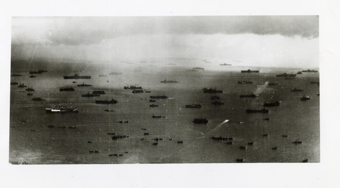 La flotta navale americana si prepara all'approdo sull'isola di Iwo Jima, nel febbraio 1945