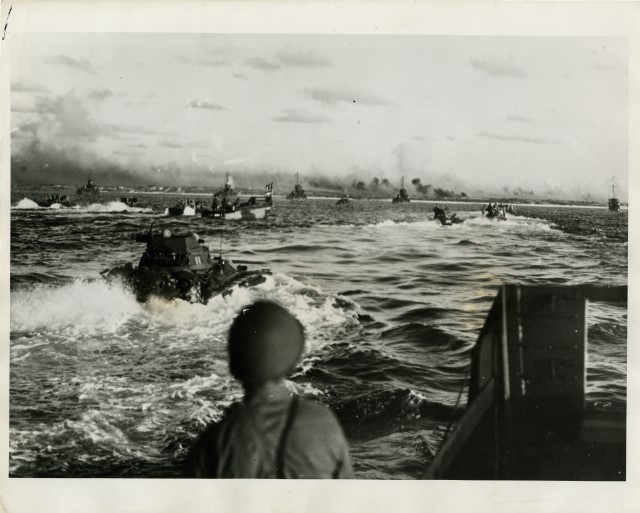 Mezzi anfibi americani durante il primo attacco a Aguni Jima, nell'arcipelago di Okinawa, avvenuto il 9 giugno 1945. In primo piano un marinaio.