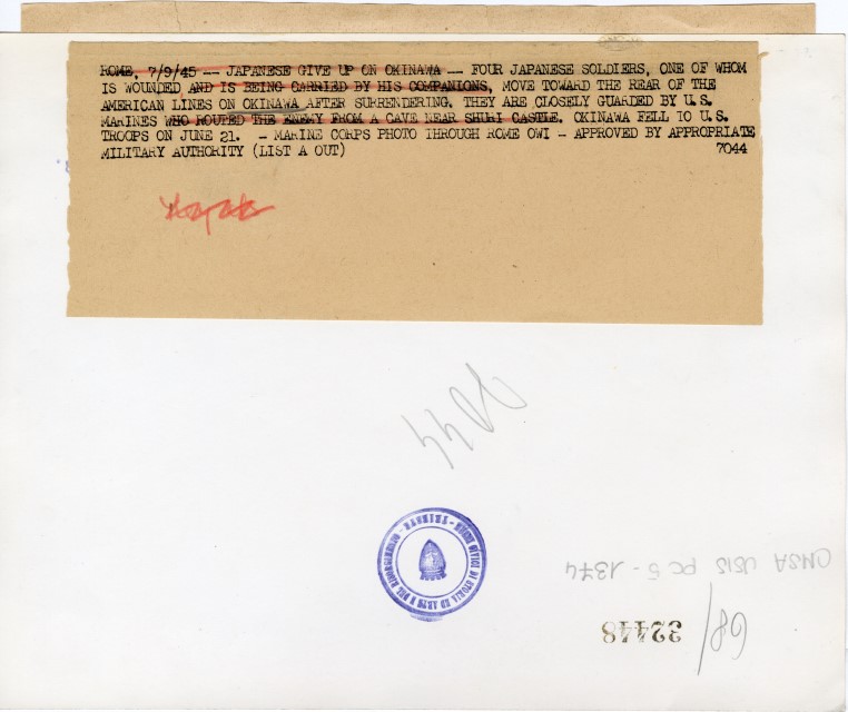 Soldati giapponesi, fatti prigionieri ad Okinawa, trasportano un loro commilitone ferito.
