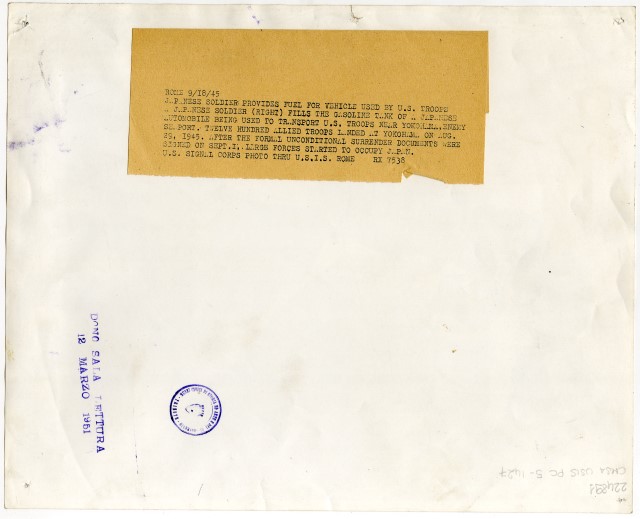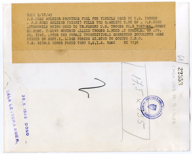 Un soldato giapponese riempie il serbatoio di un'automobile, che servirà al trasporto delle truppe americane.