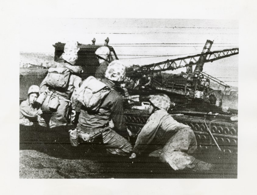 Marinai americani accovacciati dietro un mezzo da assalto durante la battaglia di Iwo Jima.
