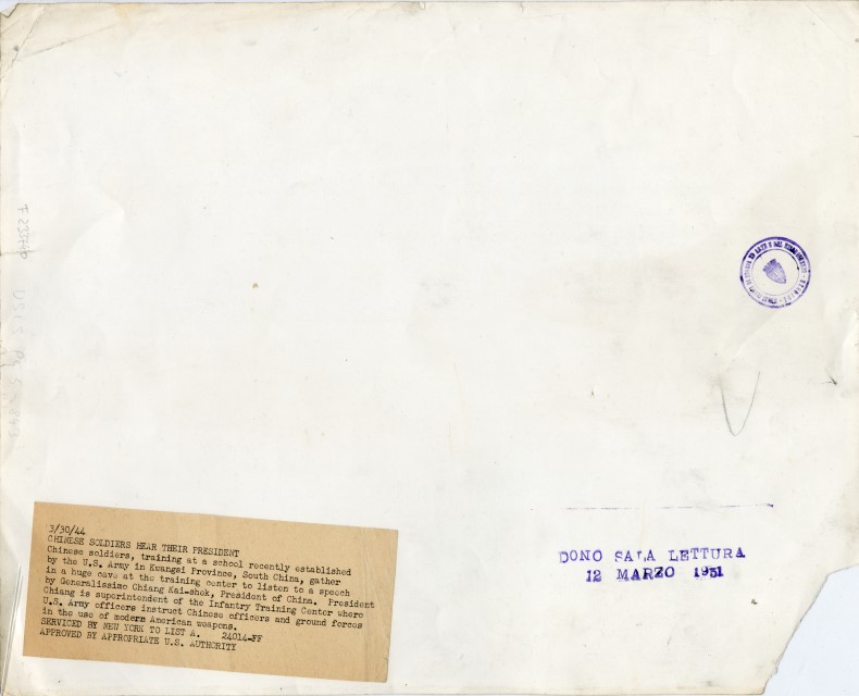 In una delle grandi grotte naturali della provincia cinese di Kwangsi, il generalissimo Chiang Kai-shek fonda un centro di addestramento della fanteria durante la guerra, per evitare che le sue reclute vengano uccise dai giapponesi. Nella foto Chiang si rivolge alle reclute.