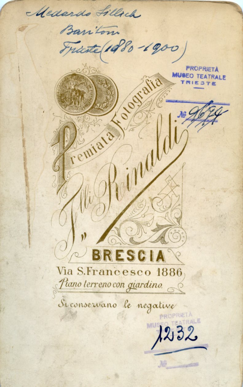 In costume nel ruolo di Jago in "Otello". Cantò al Politeama Rossetti di Trieste in concerto di beneficenza il 12.12.1888 , e il 15.11.1901 in concerto con la violinista Teresina Tua. Nel 1889 a Parma nella "Carmen" e alla Scala di Milano in "Simon Boccanegra"; nel 1893 al Teatro Grande di Brescia in "Otello", nel 1895 in "Ruy Blas" e "Ernani" al Teatro Cressoni di Como