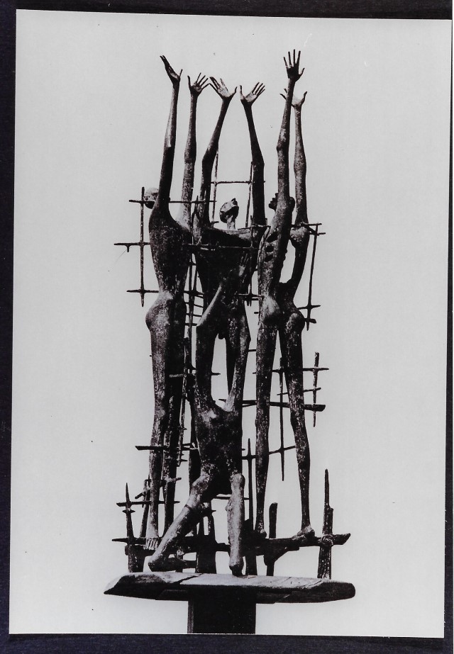 La scultura in bronzo (altezza 185 x 80 x 55 cm) con firma e monogramma dell'autore in basso a destra, è stata collocata il 22 giugno 1975 nella Sala delle Commemorazioni. L'ambiente, dopo essere stato un garage all'interno della Risiera di San Sabba, era stato risistemato a Cappella dall'architetto Romano Boico. Notizie tratte dalla scheda dell'opera del volume Le sfide della memoria. Alfonso Mottola fotografa, su commissione del Comune di Trieste, la realizzazione di alcune cartoline dedicate al monumento ideato da Romano Boico. Tratto dal catalogo L'archivio di Alfonso Mottola nella Fototeca dei Civici Musei di Storia ed Arte. Non solo fotografie