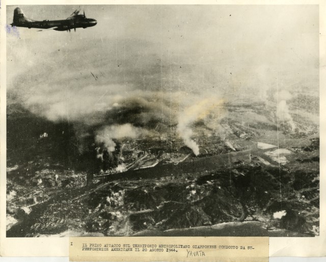 Bombardamento aereo dell'acciaieria giapponese di Yawata del 20 agosto 1944, da parte delle Superfortezze B-29, una delle quali appare nel lato superiore sinistro della fotografia.
