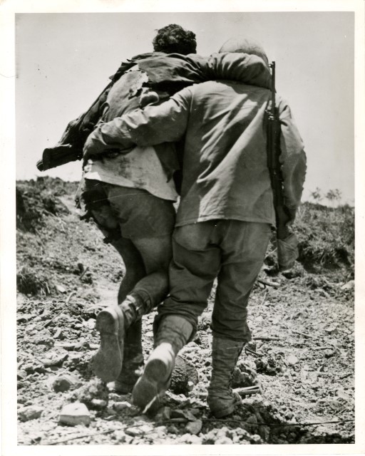 Un soldato americano, ferito durante la battaglia di Okinawa, viene portato in spalla da un commilitone per raggiungere le retrovie americane.