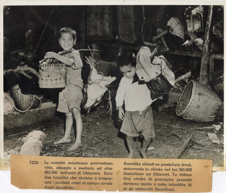 Due bambini di Okinawa aiutano a trasportare gli averi di famiglia dal loro villaggio ai campi americani.