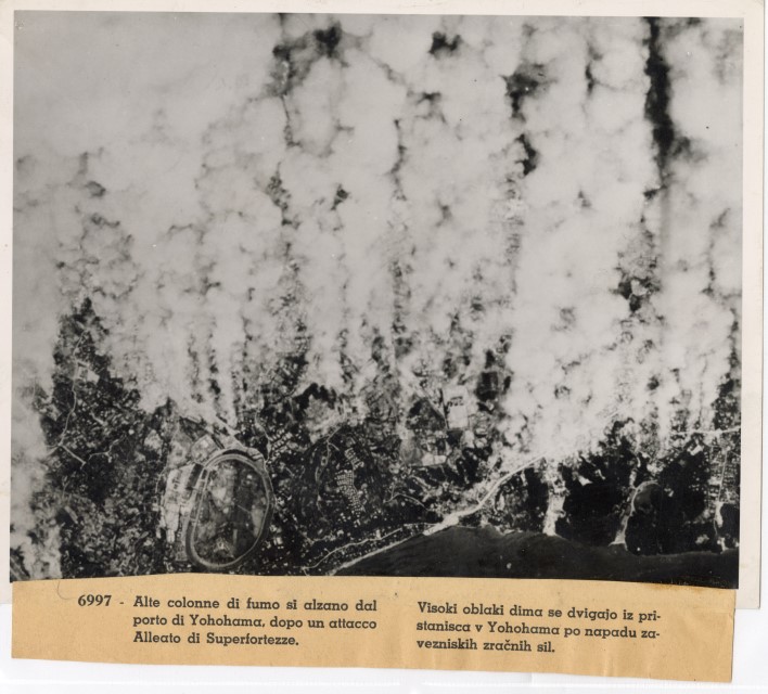 Veduta aerea di un attacco delle superfortezze americane sulla città di Yokohama.