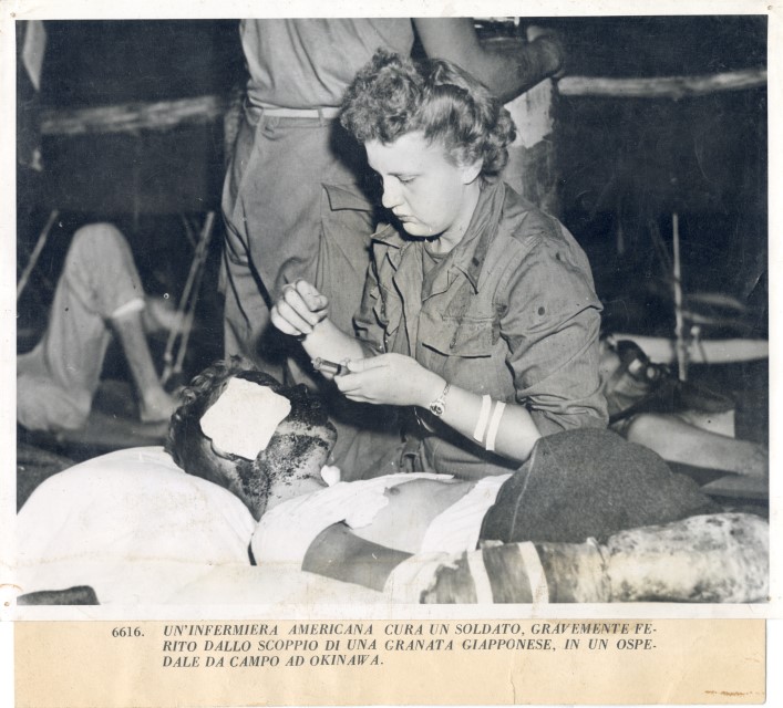 Un'infermiera cura un soldato americano ferito al volto dallo scoppio di una granata giapponese sull'isola di Okinawa