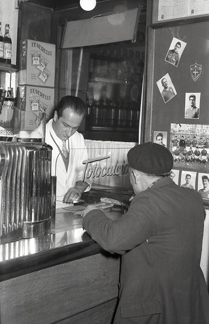 Sul bancone si nota la macchina del caffè mentre sulla mensola sono presenti le bottiglie di Bianco Sarti