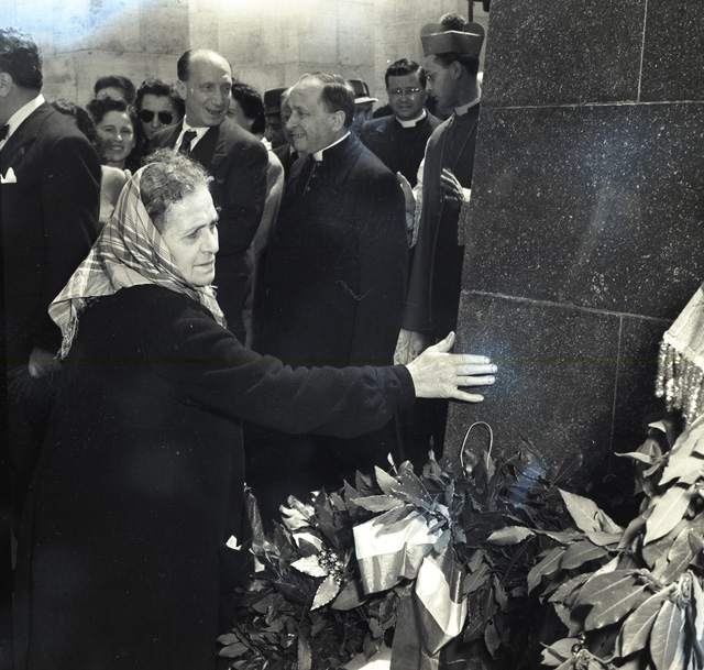 Folla presenzia alla cerimonia di inaugurazione dell'Ara Pacis Mundi di Medea. Cartellone sul muro di una casa: Sottocentro fecondazione artificiale. Uomo al volante di un'automobile