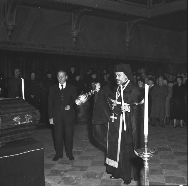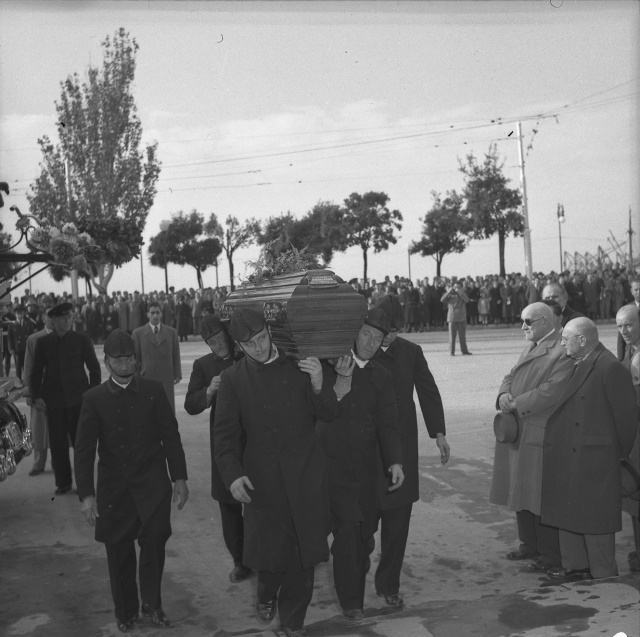 La salma del barone procede, accompagnata dalla folla, dall'ospedale Burlo-Garofolo per le vie della citta, fino alla chiesa greco ortodossa di San Nicolo per la celebrazione delle esequie.