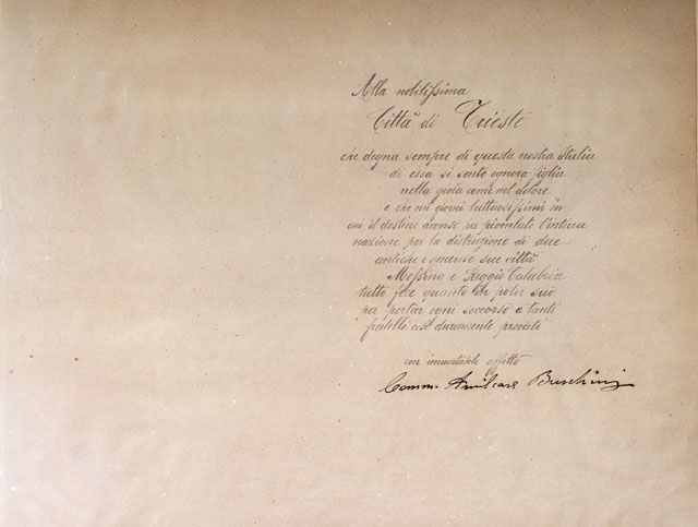 L'albo contiene le fotografie dei sovrani d'Italia, quella del duca d'Aosta, presidente del comitato nazionale di soccorso, quelle dei presidenti della Camera e del Senato Marcora e Manfredi, dei ministri e sottosegretari di Stato con le loro firme autografe, le vedute di Messina e Reggio Calabria prima e dopo il terremoto del 1908. Nella prima pagina vi è un'affettuosa dedica a Trieste. Lo Stato italiano non era intervenuto direttamente: le operazioni di soccorso erano state eseguite da istituzioni come la Croce Rossa. A seguito del cataclisma, Trieste si mobilita a favore delle popolazioni meridionali. Negli organi di stampa italiani, la generosità austroungarica nei confronti delle vittime è spesso omessa, mentre è ampiamente attestata nelle fonti fotografiche presenti in Fototeca. La guerra era nell’aria al punto tale che, quando giungono le prime notizie sulla distruzione di Messina a Roma, si pensa a un bombardamento della flotta austriaca. L’undici luglio 1909, il milanese Leandro Ghisi consegna l’album di ringraziamento al podestà Scipione Sandrinelli, a nome del commerciante milanese Amilcare Boschini, organizzatore di una manifestazione di riconoscenza per quanto il mondo ha fatto in favore dei terremotati.