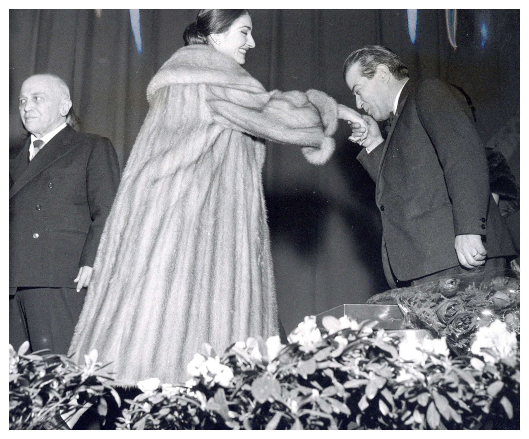 Maria Meneghini Callas, Cinico Angelini e Giovanni Ermete Gaeta (E. A. Mario) autore del Piave, alla Serata della Canzone al Palazzo dello Sport, Milano 22/12/1957