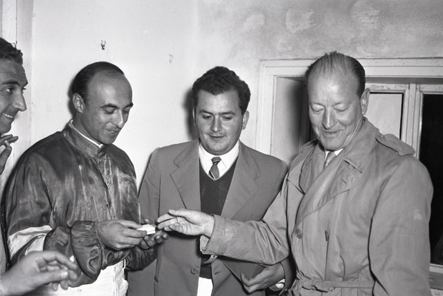 Vince la gara Bruno Vitaliano del Gazzettino Sera a cui viene consegnata una riproduzione del Campanone di San Giusto. Testo tratto dalle Ultime notizie, 24.09.1954