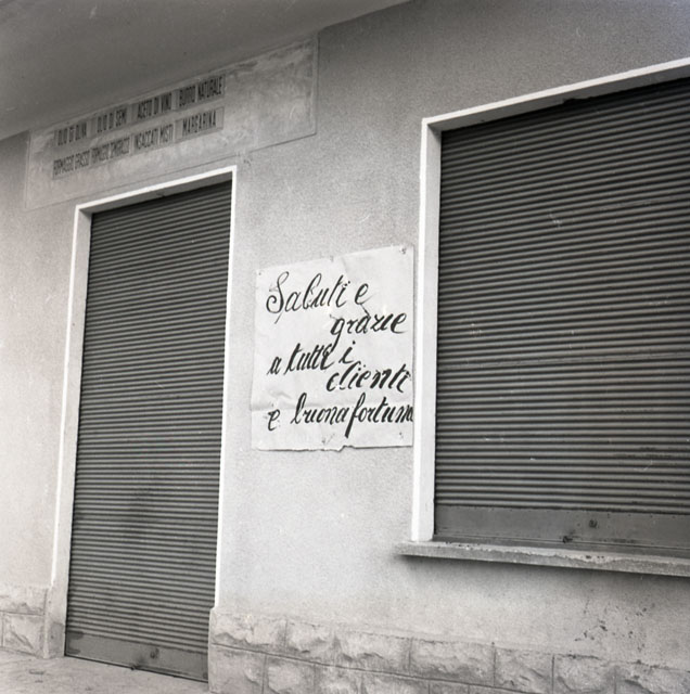 Sul muro di una casa un cartello con la scritta: Saluti e grazie a tutti i clienti e buona fortuna