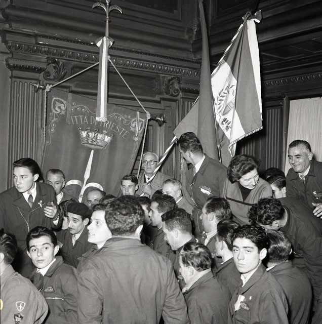 Un'autocolonna tricolore proveniente da Reggio Emilia che porta la prima bandiera tricolore della Repubblica Cisalpina donata dal Comune di Reggio Emilia alla città di San Giusto arriva il 31 ottobre in Piazza Unità. L'autocolonna viene prima ricevuta a Miramare e poi scortata fino a Piazza Unità da una colonna del Vespa Club. Testo tratto da Il Piccolo, 31.10.1954, p. 2.