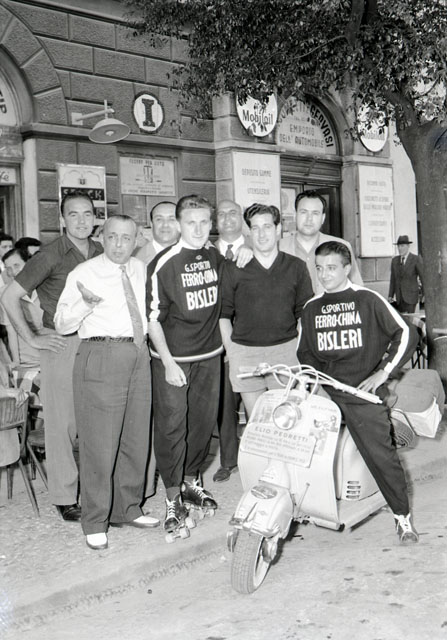Gli atleti del gruppo sportivo Ferro-China Bisleri davanti al Bar Preti e all'emporio dell'automobile Goretti & Gervasi