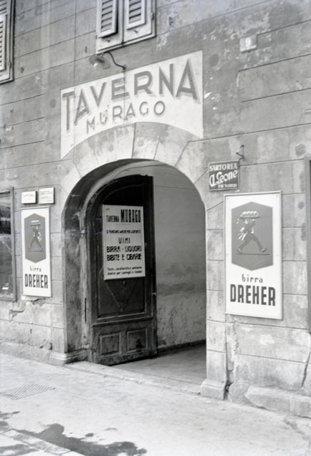 L'insegna della Taverna Murago che offre ai suoi clienti vini birra liquori bibite e cibarie, l'insegna pubblicitaria della birra Dreher e accanto le tabelle delle sartorie A.Leone, Cantelli e la camiceria FLO - RIG