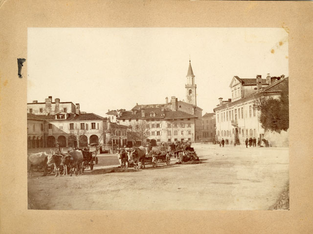 Veduta della piazza con i carri e i buoi