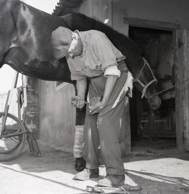 Un maniscalco intento a pareggiare o ferrare gli zoccoli di un cavallo