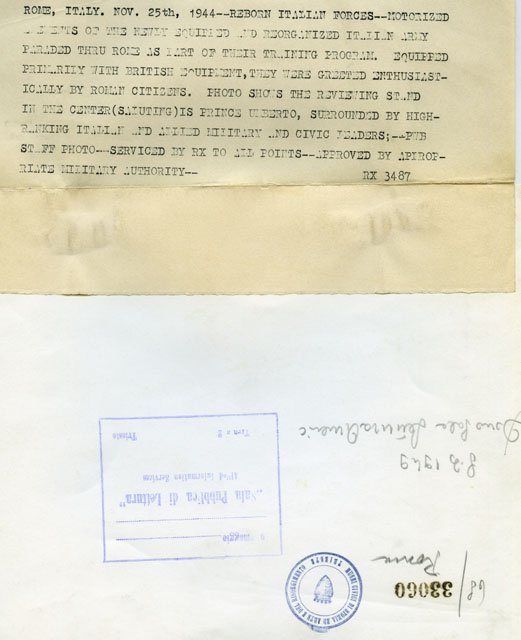 Il principe Umberto II di Savoia presiede la parata del nuovo esercito con i ministri Ivanoe Bonomi, Alessandro Casati, Umberto Tupini, il senatore Carlo Sforza