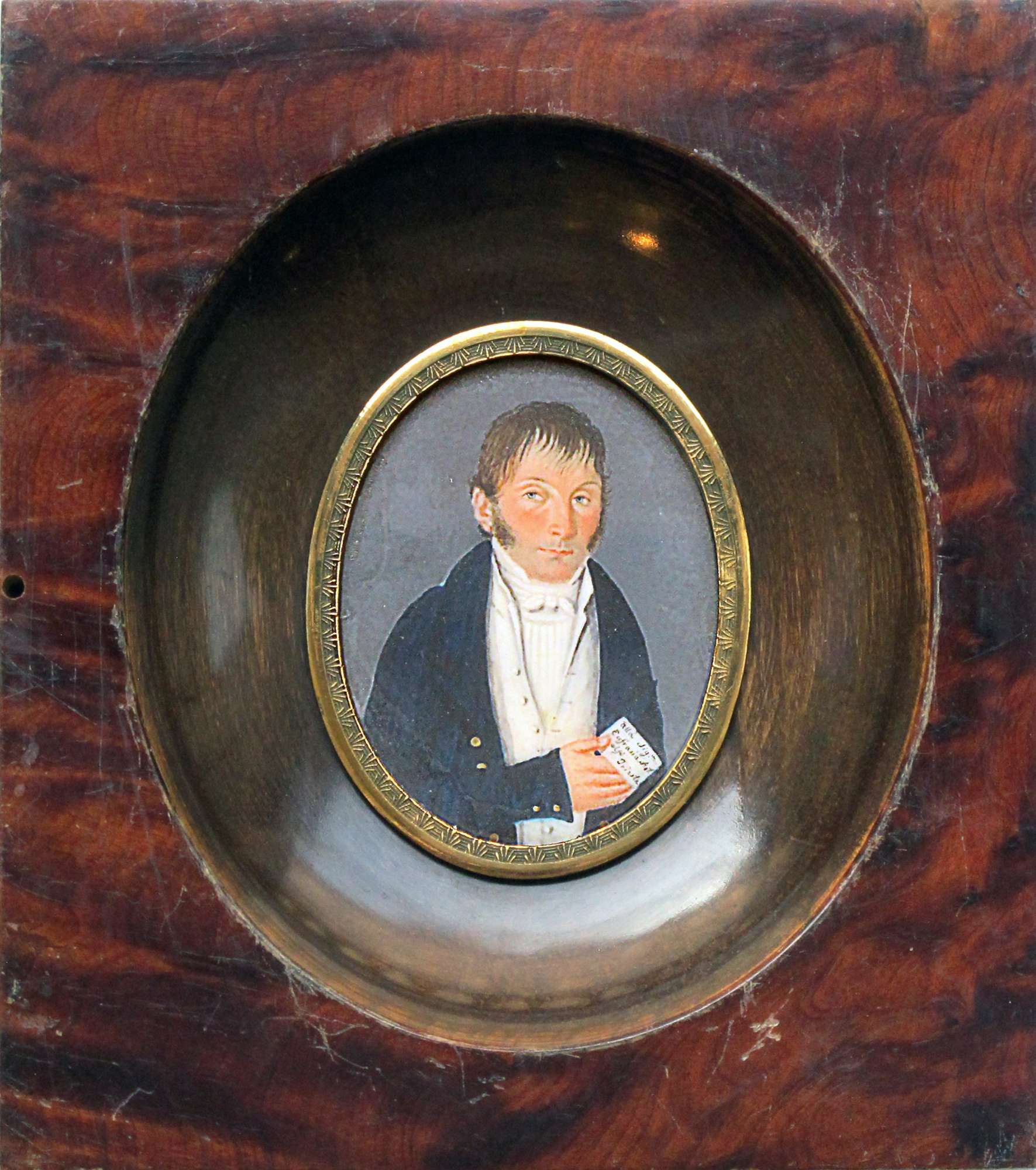 Dipinto in miniatura di forma ovale raffigurante ritratto maschile a mezza figura. L’uomo, volto lievemente verso destra, indossa una marsina blu con bottoni dorati, sopra a un panciotto e a una camicia bianca dal colletto rigido, sopra alla quale è annodata una cravatta. È ritratto in atto di porgere una lettera.