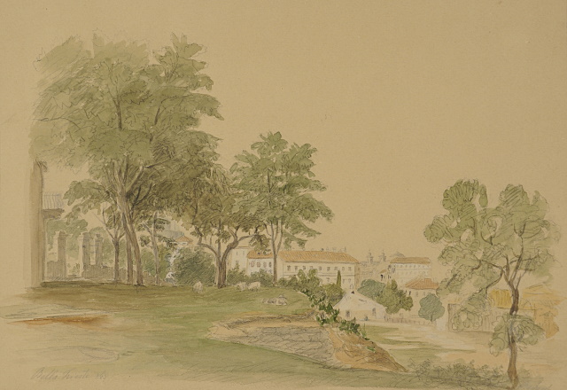 Il disegno è di mano del disegnatore, litografo ed incisore triestino Francesco Bachrach, che si firma in basso a destra, ed è datato 1865. Esso raffigura uno scorcio di Trieste, colto presumibilmente da via Romagna nel rione di Scorcola (cfr. Zubini 1997), dato l'orientamento della chiesa di Sant'Antonio Taumaturgo ben visibile sullo sfondo al centro e del Castello di San Giusto, che si intravede sulla sinistra attraverso gli alberi.