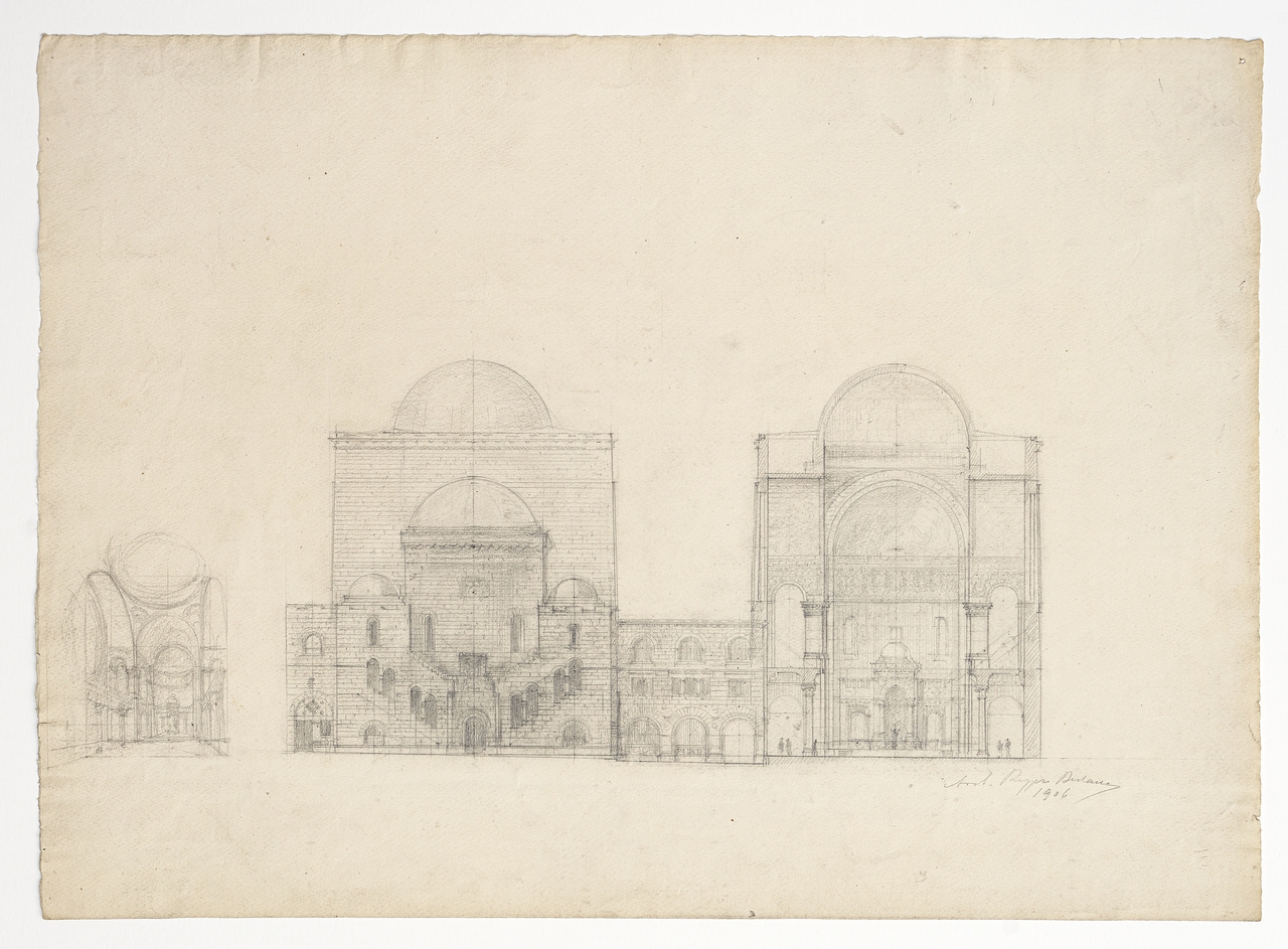 Progetto per la Sinagoga di Trieste: facciata su via Guido Zanetti, prospetto interno. Sul foglio si noti anche un piccolo schizzo prospettico dell'interno.