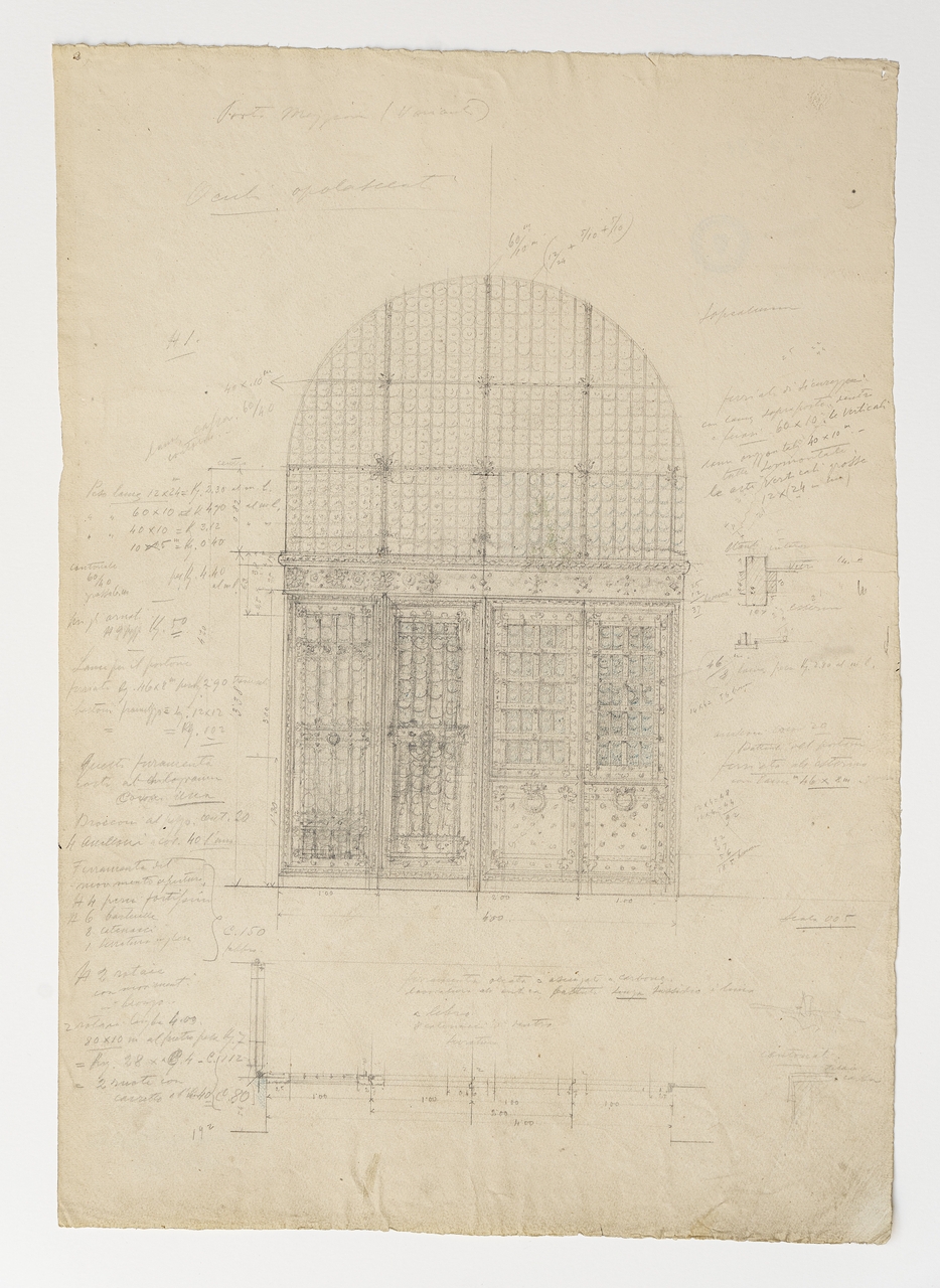 Il disegno illustra una variante per la porta maggiore della Sinagoga di Trieste ed è integrato da note tecniche, tra cui l'indicazione di vetri opalescenti.