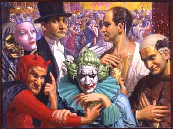 Nel corso della seduta del Curatorio del 25 luglio 1931, si riporta a verbale l'accettazione di due opere proposte al Museo Revoltella dal Podestà, ovvero il quadro qui esaminato e la Fanciulla di Guido Cadorin, due significative e diversificate testimonianze dell'attività artistica locale e nazionale del secondo e terzo decennio del ‘900. “Cesare Sofianopulo, pittore, poeta, traduttore, solerte indagatore di civiche vicende, ripropone in termini di una più precisa configurazione spirituale, quel prototipo di «homo tergestinus» in cui amano consapevolmente riconoscersi molti abitanti della città adriatica.” Con queste parole Bianca Maria Favetta (B. M. Favetta, 1973, p. 17) descrive la poliedrica e originale personalità dell'artista triestino di origine greca, singolare e appassionato interprete del clima decadentista di fine secolo. Inizialmente allievo di Argio Orell, partecipa all'Esposizione Permanente di Trieste del 1908. Dal 1910 al 1915 studia all'Accademia di Belle Arti di Monaco di Baviera dove segue i corsi di Yank e di von Stuck. Durante un soggiorno a Parigi (1911-1912), entra in contatto con Jean Paul Laurens, Lipchitz, D'Annunzio e Modigliani. Più che l'esperienza francese, risulta determinante, nella formazione stilistica di Sofianopulo, la padronanza della tecnica minuziosa e il disegno sicuro e tagliente acquisiti nell'ambiente tedesco, che ben si riflettono nell'opera qui considerata. A partire dalle opere della fine degli anni Dieci, mediante la resa iperrealistica dei dettagli e l'attenzione agli effetti simbolici del colore, Sofianopulo anticipa esiti del Realismo Magico. Giornalista e traduttore (nel '37 traduce i Fiori del male di Baudelaire), oltreché pittore, partecipa nel 1924 alla XXIV Biennale di Venezia. Fin dagli esordi della sua attività l'artista rivela un insistito interesse per la ritrattistica. Indagare l'animo umano e approfondire la conoscenza di sé stesso mediante l'arte diviene per lui necessità, che ha come conseguenza una lunga serie di ritratti e autoritratti per lo più realizzati negli anni Venti e Trenta. In essi l'artista manifesta una notevole capacità d'indagine introspettiva. Anche nell'opera in esame l'osservazione di sé stesso costituisce l'aspetto preponderante della composizione se è vero, come riporta Fasolato nella scheda del dipinto (1994), che l'ideazione di questa singolare opera venne all'artista quando raffigurò una testa di pagliaccio con le sue fattezze, da cui il desiderio di ritrarre la propria figura con stravaganti travestimenti. La marcata contrapposizione tra la festosa atmosfera carnascialesca e la macabra visione del teschio a sinistra della scena, evidenzia lo stato d'animo del pittore che, due anni innanzi aveva assistito alla morte del padre, durante i festeggiamenti del carnevale (“Il Piccolo”, 1968). Nelle Maschere l'ossessivo moltiplicarsi dell'ego trasfigurato (l'artista si ritrae per cinque volte in vesti diverse) soddisfa il pirandelliano concetto di metamorfosi della personalità a cui Sofianopulo mira nel corso della minuziosa e variegata disamina che egli compie continuamente su sé stesso. In questa stravagante composizione l'artista sembra passare in rassegna le molteplici sfaccettature della propria indole ed esprimere – come rileva Malabotta nel '30 – le varie “possibilità fisionomiche”, raffigurandosi di volta in volta “angelico, pensoso, satanico, imperatorio e irresistibile”. “Un quadro psicologico” – lo definisce Benco nel '30 – in cui il lavorio intellettuale del pittore non viene dissimulato dalla leggerezza e dalla vivacità compositiva e cromatica del dipinto.