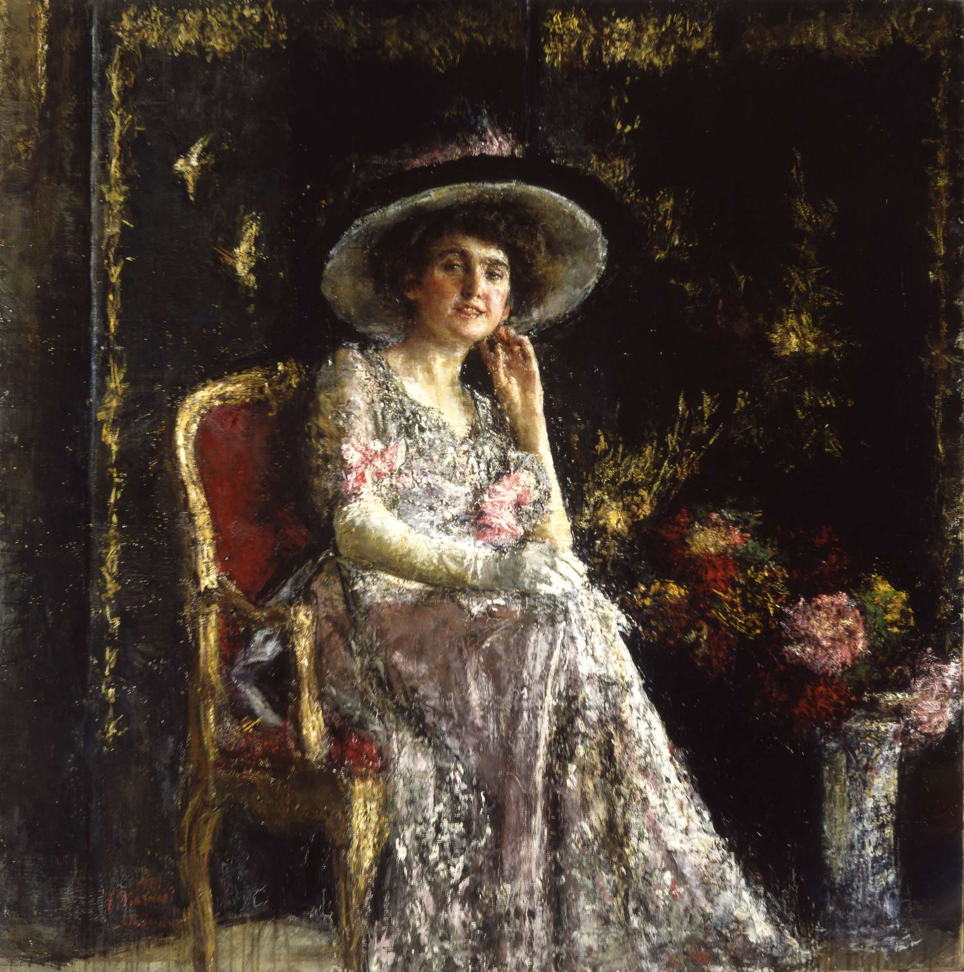 Questo raffinatissimo ritratto femminile, proveniente dalla collezione del mercante tedesco Otto Messinger, fu acquistato dal Museo Revoltella all'Esposizione Internazionale di Roma del 1911, dove Mancini, presente con otto dipinti, fu uno degli artisti premiati. Geltrude, che un critico presentava come “espressione della femminilità e dell'eleganza borghese”, era in realtà una modella tedesca, che posò per il pittore durante il suo soggiorno a Monaco nel 1909-1910. Sul piano stilistico Mancini s'ispirò alla pittura impressionista, come rivelano le tinte luminose e i contorni indefiniti, ma, per restituire sulla tela lo sfolgorio metallico delle pietre preziose, degli ori e degli argenti, introdusse nel dipinto anche pezzi di vetro e frammenti di piombo ritagliati dai tubetti dei colori. L'artista viaggiò molto per conoscere i capolavori dei grandi maestri del passato. Dallo studio del Seicento olandese e napoletano fu indotto alla grande composizione e alle ricerche sul colore e il chiaroscuro, che resero la sua pittura molto apprezzata sia in Europa che negli Stati Uniti.