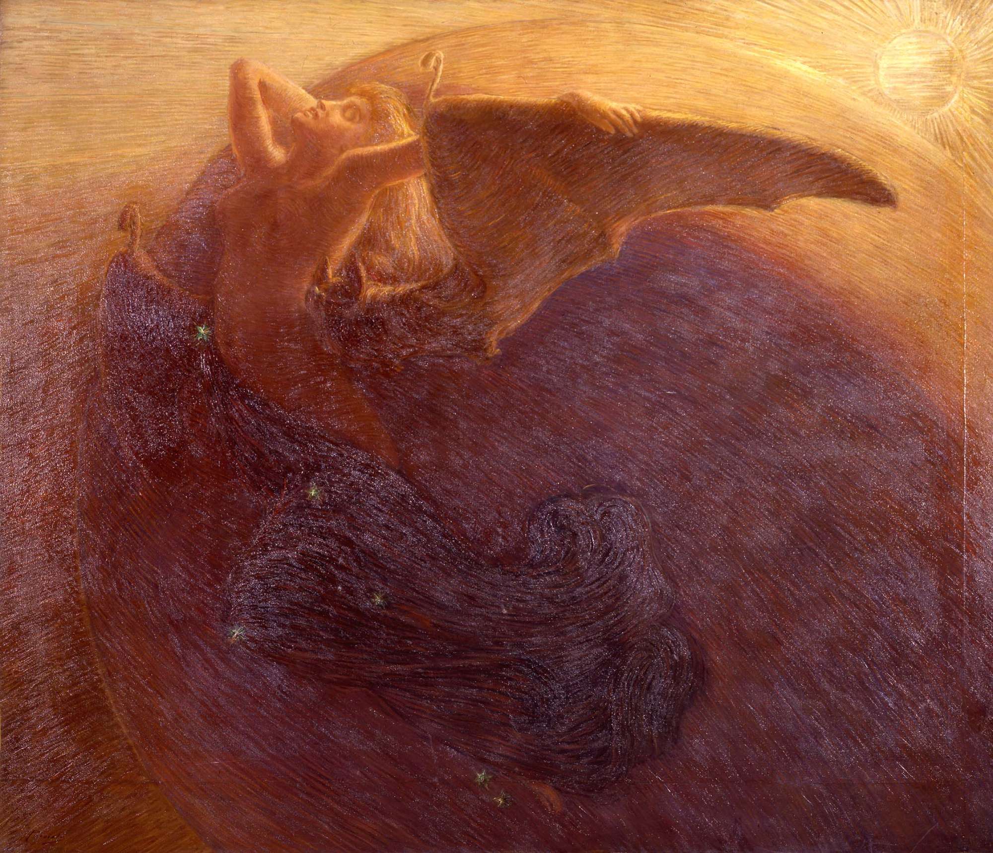Eseguita nel 1905 ed esposta alla Biennale di Venezia dell'anno successivo, quest'opera di Previati è entrata a far parte della collezione del Museo Revoltella nel 1936, quando è stata oggetto di una permuta con la Galleria Trieste, che l'ha ceduta in cambio di ben tredici opere. La figura femminile in controluce, avvolta in un velo nero trapuntato di stelle e con un pipistrello alle spalle, simboleggia la Notte, destata dalla luce diurna del disco solare. Il soggetto riconduce all'eterna lotta tra Bene e Male, tematica tra le più trattate dai simbolisti europei, con i quali Previati era in stretto contatto. Interessante è soprattutto la tecnica impiegata, basata sull'utilizzo di pennellate divise, dense e filamentose, e di una gamma cromatica studiata secondo i principi scientifici della visione. Previati fu, con Grubicy e Segantini, uno dei massimi esponenti del Simbolismo italiano. Mentre all'estero la sua fama si consolidò molto presto, in particolare con la partecipazione alla mostra divisionista di Parigi nel 1907, in patria ebbe successo solo alla fine della sua carriera.