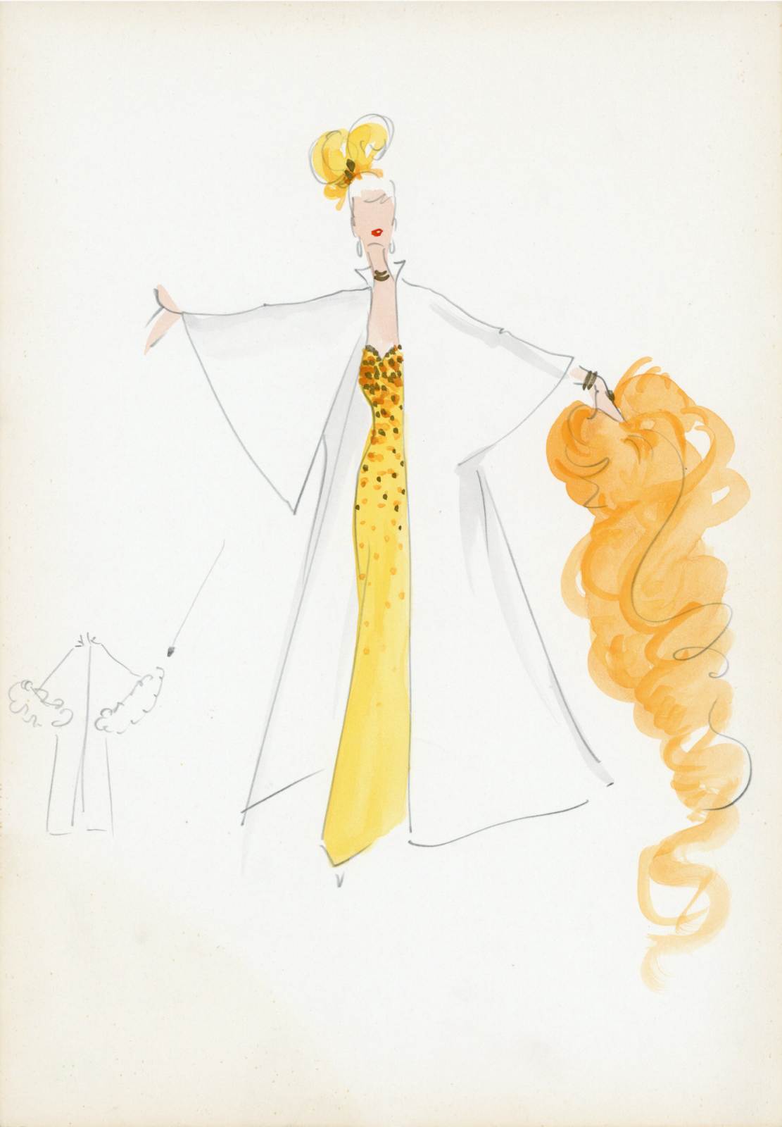 La vedova allegra, operetta di Franz Lehár, figura femminile in abito da sera giallo e soprabito bianco, indossa gioielli e piume, boa color arancio, a sinistra piccolo schizzo del mantello visto dal retro