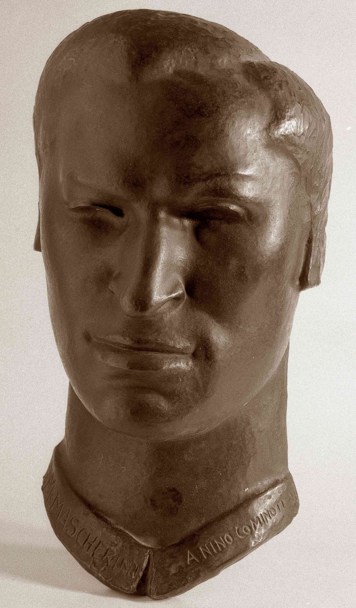 È uno dei primi ritratti maschili, realizzato nel ’29 ed esposto due anni dopo, nel 1931, alla V Esposizione d’arte del sindacato regionale fascista di Udine assieme a due bronzetti presentati in seguito anche alla Biennale di Venezia del 1934. L’opera si qualifica per una forma sintetica, con i tratti somatici resi attraverso piani lisci e il volume compatto dei capelli stilizzati. Presenta un’asciutta modellazione dei piani di un volto asimmetrico, con zigomi prominenti e ampie mandibole, con labbra serrate e sguardo asimmetrico. Nino Cominotti nacque nel 1907, frequentò sin da giovane gli ambienti del Circolo Artistico di Trieste e del futurismo triestino diventando amico del coetaneo scultore Mascherini. Sposato con la pittrice Hansi Glancz, i due fondarono nel secondo dopoguerra alcune gallerie d’arte a Trieste e il loro salotto fu per un lungo periodo un punto di riferimento per il mondo culturale e non della città. Nel 1984 la pittrice triestina cedette al museo quattro opere di Mascherini e tra queste il ritratto del marito.