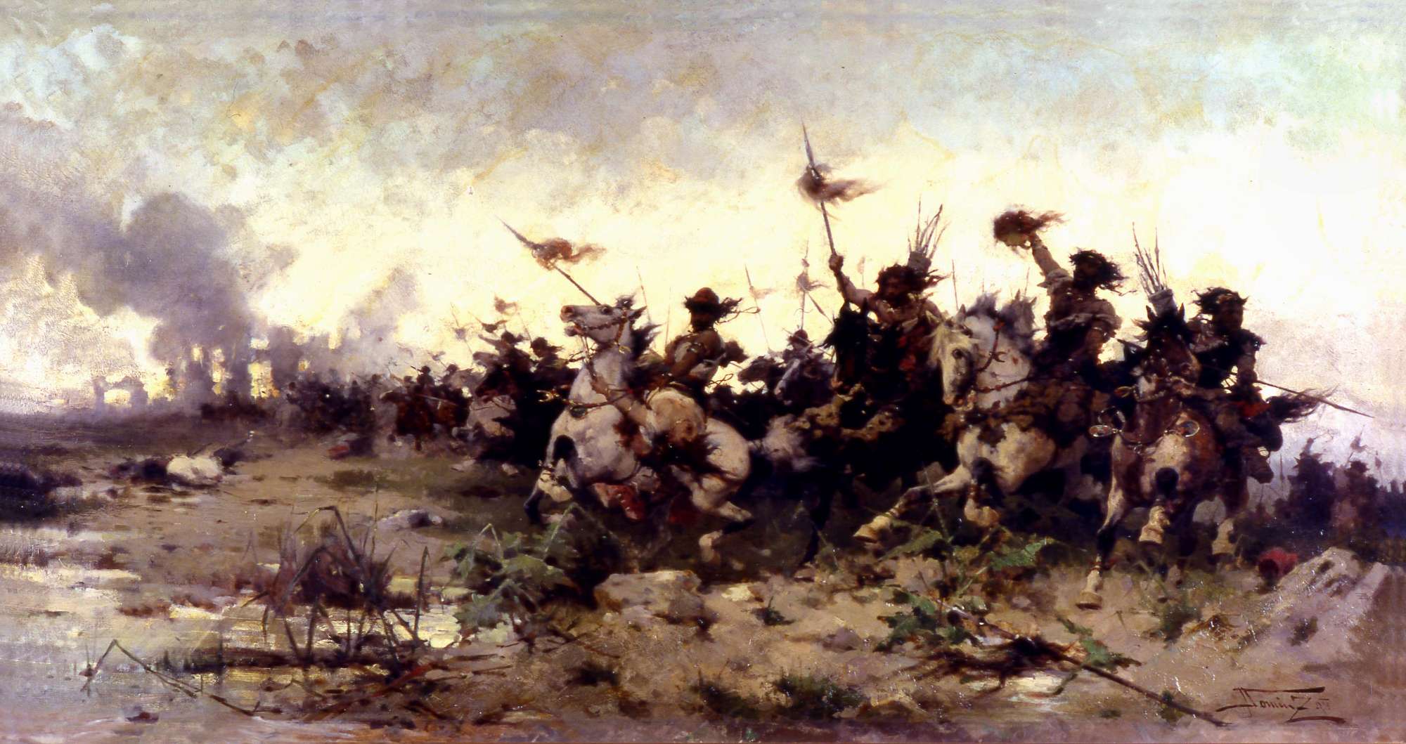 Il dipinto è ispirato dall'assalto di Attila alla città di Aquileia nel 452 d.C. La carica degli Unni che conquistarono la città romana dopo tre mesi di assedio è ricostruita con cura, come dimostrano i costumi e i trofei con le teste dei nemici. Tuttavia l'episodio storico funge solo da pretesto per Alfredo Tominz per mettere in scena una corsa di cavalli che era suo soggetto prediletto.