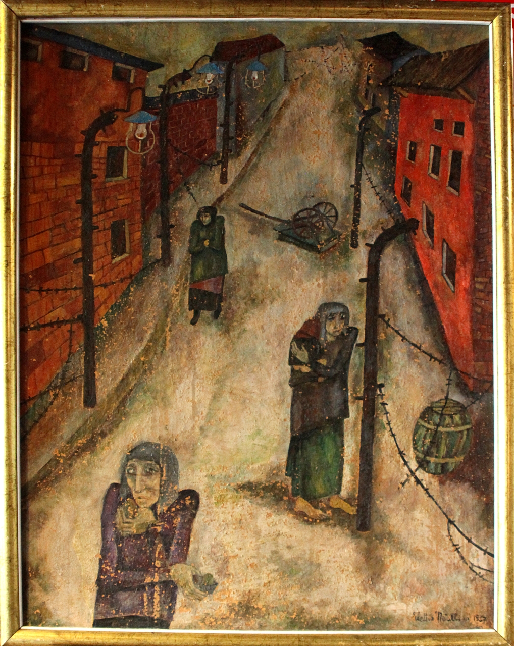 Il dipinto rappresenta tre figure femminili che avanzano meste in una strada chiusa dal filo spinato. Su entrambi i lati, oltre il filo spinato, compaiono edifici in muratura. Sulla strada, a destra in secondo piano, si vede una botte, mentre sullo sfondo appare un carretto rovesciato.