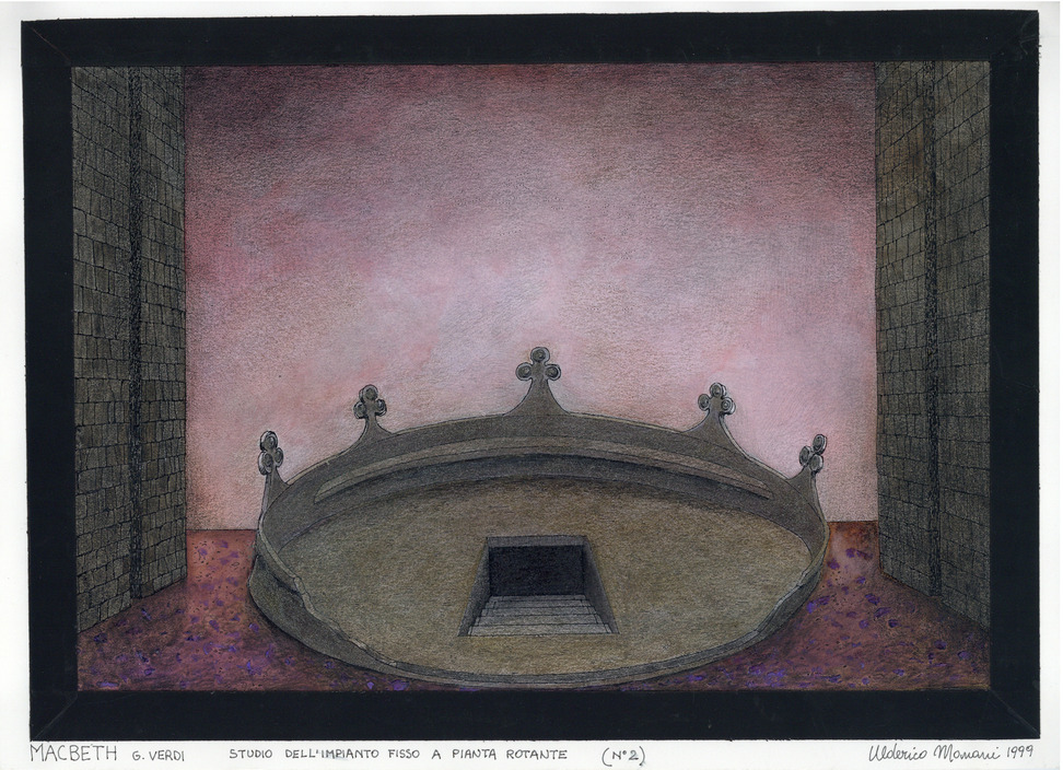 Macbeth, opera lirica di Giuseppe Verdi. Imponente impianto scenico a pavimento, in pendenza verso il boccascena, a forma di corona circolare, con punta centrale decorata a trifoglio, occupa tutto lo spazio scenico. Ai lati due alte mura con fessura centrale per il paesaggio. Una botola è aperta al centro della corona, luce rosa/ violacea