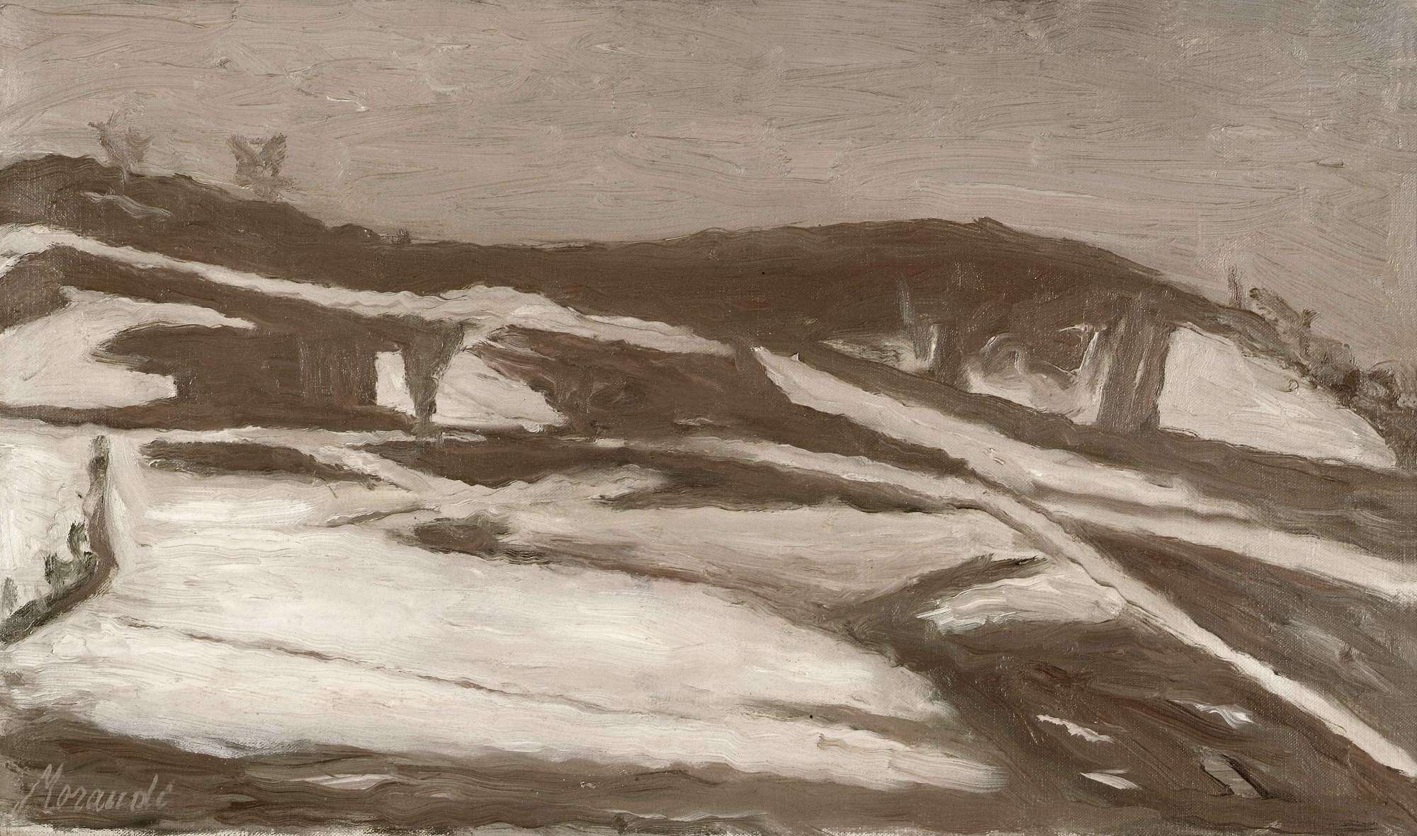L'opera riveste un pregio particolare nella produzione di Morandi, in quanto è uno dei rarissimi paesaggi dipinti dall'artista nel 1944 (dal catalogo generale curato da Lamberto Vitali nel risultano solo tre, incluso il presente). Dal mese di giugno dell'anno precedente, infatti, egli soggiornava con la famiglia a Grizzana, borgo collinare tra Bologna e Firenze dove aveva affittato la Casa Veggetti con l'intento di trascorrervi solo la stagione estiva. La situazione bellica lo costrinse però a fermarsi fino ai primi di settembre del ‘44, quando finalmente poté rientrare a Bologna. In questi quattordici mesi, grazie al contatto con la natura, maturò una consapevole rassegnazione agli eventi e, come ha rilevato Francesco Arcangeli, accettò quella condizione di estrema solitudine come “mortalmente serena”. La sua attività pittorica, però, fu molto ridotta: come scrisse l'artista in una lettera allo stesso Arcangeli, per poter dipingere all'aperto era necessario disporre di un permesso del Comando Regionale dell'Esercito Italiano. Scaduta questa autorizzazione e aumentato il pericolo di bombardamenti, a partire dal settembre del ‘43 egli dovette limitarsi a riprendere il paesaggio dalle finestre delle due stanze all'ultimo piano di Casa Veggetti. Da questo punto di vista sopraelevato dipinse presumibilmente anche l'opera del Revoltella, eseguita dopo un lungo periodo di inattività e ispiratagli dal paesaggio imbiancato dalla nevicata del marzo 1944. Morandi non accenna qui minimamente all'approssimarsi della primavera, ma dipinge una neve livida che risalta contro il grigio del cielo e del suolo; l'effetto suggerito è quello di una desolante solitudine,ulteriormente accentuata dalla totale assenza della figura umana e di edifici che ad essa rimandino.
