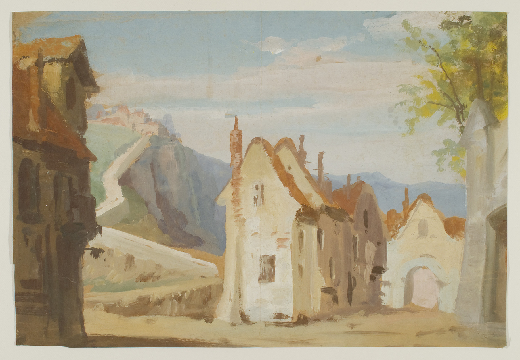 Bozzetto per scenografia raffigurante un agglomerato di case in un paesaggio montuoso