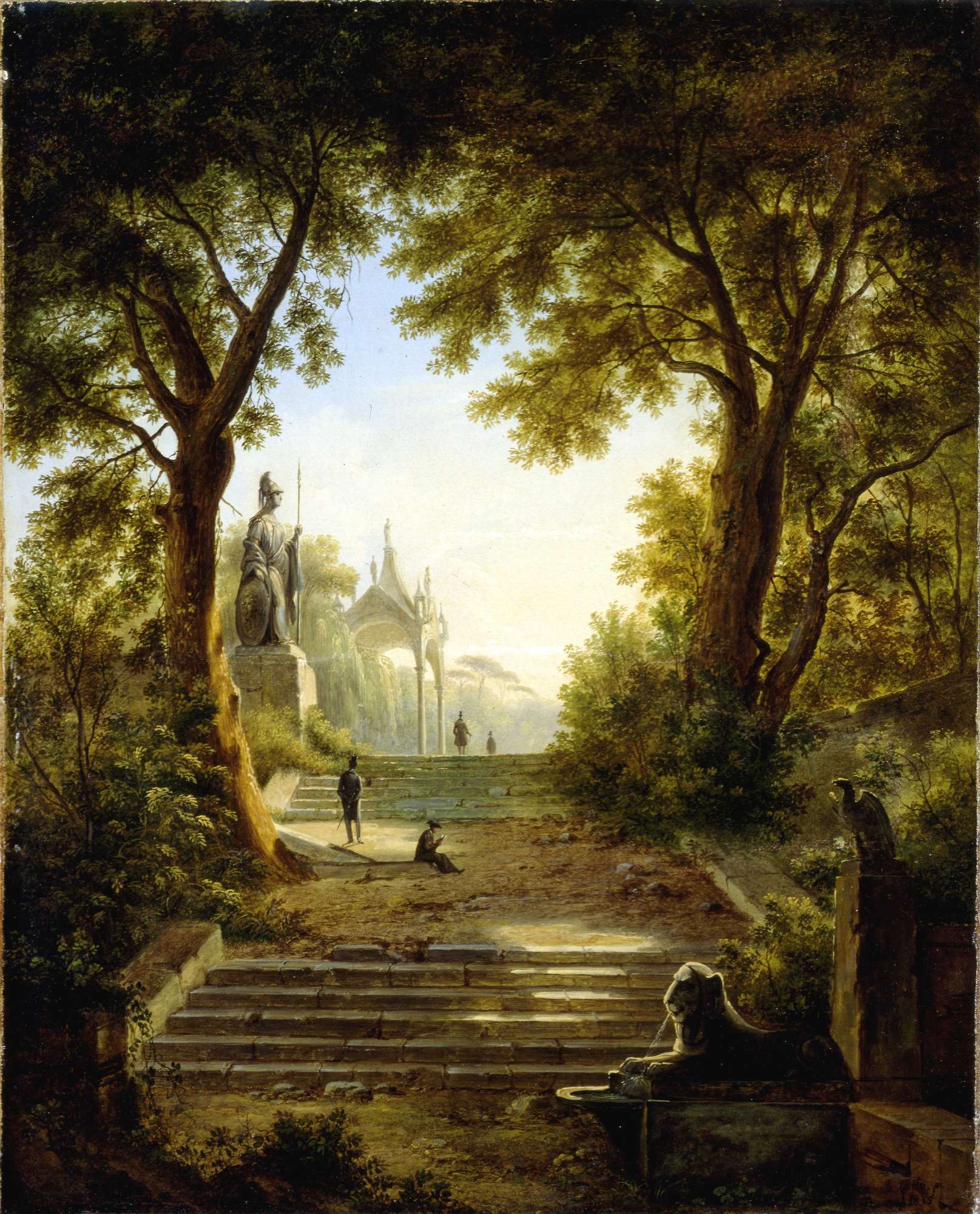Nell'Inventario del Museo Revoltella il "Paesaggio fantastico" di Scarabelotto corrisponde al numero 1, posizione che farebbe ritenere quest'opera la più significativa tra quelle lasciate in eredità dal barone per costituire il museo, non solo per il suo valore artistico ma anche perché è verosimile che sia stato il suo primo acquisto. La data del dipinto, infatti, il 1835, coincide con un momento molto importante per Pasquale Revoltella, che, a quarant'anni, apre una sua casa commerciale ed entra decisamente a far parte dei protagonisti del mondo finanziario triestino. Va ad abitare in una casa prestigiosa (la Casa Fontana in via del Pesce) e probabilmente inizia anche la sua collezione d'arte. Nel 1835 Scarabelotto (l'esatta dizione del cognome, abitualmente trascritto come “Scarabellotto”, così come la ricostruzione della sua vita, per certi aspetti misteriosa, e l'analisi della sua produzione si devono all'ampio lavoro di S. Sorrentino) si era appena trasferito a Roma per lavorare come scenografo, ma manteneva contatti, tramite l'amico Giuseppe Gatteri, con il mercato triestino da cui continuava a trarre una fonte di sostentamento. Il" Paesaggio fantastico" fa parte quasi sicuramente di una serie di dipinti da lui eseguiti a Roma e spediti nell'autunno del 1835 a Trieste (lettera a G.Gatteri del 28 ottobre 1835, cit. da Sorrentino, p. 138), e corrisponde forse a uno dei due quadri senza un destinatario preciso (“li darete a chi vorrete”) che “per variare” aveva fatto “per lungo”. Uno di questi viene definito sommariamente “un sito solitario nella Villa Borghese” e pare verosimile che si tratti del Paesaggio fantastico. Nello stesso elenco figura anche "La piramide di Caio Cestio" pure acquistata da Revoltella (inv. n. 3), mentre il terzo Scarabelotto posseduto dal barone è probabilmente dell'anno seguente: il dipinto che porta il numero 2, infatti, "Chiaro di luna – Paesaggio", che raffigura la morte di Giulietta e Romeo, è certamente da collegarsi alle scene eseguite da Scarabelotto nel 1836 per la rappresentazione de I Capuleti e i Montecchi al Teatro Apollo di Roma. I tre dipinti dopo il trasferimento, nel 1858, nella nuova dimora di Palazzo Revoltella, trovarono collocazione nell'anticamera. L'esperienza romana, di cui questi lavori rappresentano l'esordio, fu decisiva per la maturazione del linguaggio di Scarabelotto, ancora permeato del vedutismo settecentesco assimilato dal Bison, e lo indirizzò verso il naturalismo romantico, sia pure condizionato dall'eredità neoclassica e dal gusto per l'effetto scenografico della rovina.