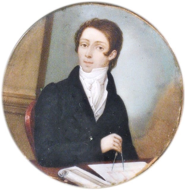 La miniatura ritrae, in uno spazio spoglio, reso in modo sommario, un architetto al tavolo di lavoro. Compasso alla mano sembra interrotto nell’attività di misurazione del disegno progettuale cui stava dedicandosi, per volgersi verso il riguardante. La foggia dell’abito e l’acconciatura consentono di datare l’opera entro la prima metà del secolo XIX; meno agevole è il riconoscimento dell’autore, che si sofferma nell’indagine dei bianchi nel colletto della camicia e nella cravatta. Nell'inventario storico è stata attribuita all'ambito Italia settentrionale.
