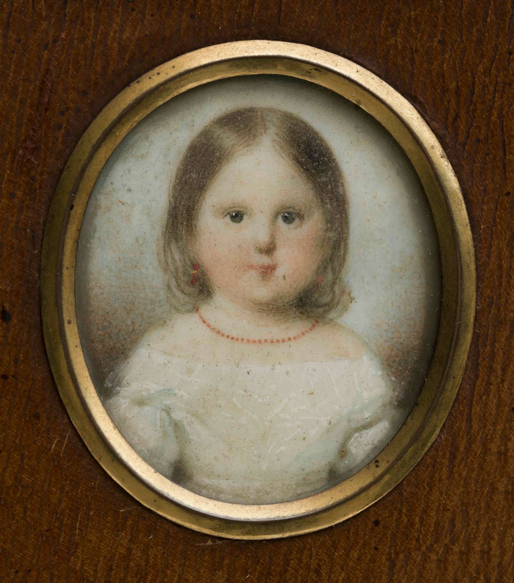 Miniatura di formato ovale appartenente a una serie di cinque che ritraggono la famiglia di Carlo Antonio Fontana (Trieste,1809-1886) e Adele Reisden (Trieste, 1814-1875). In particolare, l’opera ritrae Natalia Fontana bambina (Trieste, 1835-1858), vestita di una leggera veste bianca adorna di merletti, con orecchini e un filo di vaghi in corallo, materiale usato negli ornamenti infantili per le sue proprietà amuletiche. Dell’effigiata, è noto un ritratto di gruppo con i fratelli Carlo e Adelaide di mano di Michael Stohl (inv. 18025), datato 1841, che costituisce un termine ante quem per la datazione della miniatura in esame. Sempre nelle collezioni dei Civici Musei di Storia ed Arte di Trieste si conservano un busto marmoreo di Natalia firmato da Angelo Cameroni e una miniatura di Andrea de Castro (inv. 18084), ambedue datati al 1858, anno della morte della fanciulla.