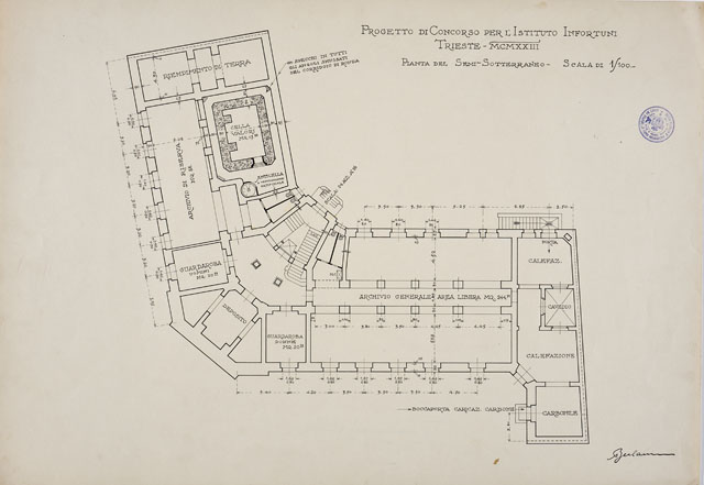 Si tratta di uno dei disegni della serie "Progetto per la costruzione della sede dell'Istituto Nazionale d'Assicurazione per gli Infortuni sul Lavoro in via Coroneo" eseguiti da Arduino Berlam, cfr. schede CMSAOAR10_4245 - CMSAOAR10_4271. Nel dicembre 1922 Arduino Berlam venne invitato a partecipare al concorso per la sede dell'Istituto Nazionale d'Assicurazione per gli Infortuni sul Lavoro, che sarebbe stata realizzata in via Coroneo a Trieste. Egli presentò la sua proposta il 14 marzo 1923, che non venne selezionata: fu preferito il progetto degli architetti Enrico e Umberto Nordio. La tavola in esame illustra la planimetria definitiva del semi-sotterraneo, in cui – come lo stesso Berlam afferma nella relazione allegata - "si idearono gli archivi in forma di vasti saloni, attraversati dai pilastri che sorreggono i muri dei piani superiori". Questi erano ben separati dagli ambienti destinati agli impianti di califazione centrale e ai carbonili, cui si accedeva dal cortile, attraverso una scaletta, "per diminuire le probabilità d'incendio ed impedire che il pulviscolo di carbone possa penetrare in mezzo alle carte degli archivi". La cella-valori, pensata con criteri di sicurezza moderni, è circondata da un corridoio di ronda, che Berlam immaginava provvisto di specchi posti diagonalmente nei risvolti “che rendono impossibili gli aguati da parte di malviventi”, ma soprattutto essa era delimitata da muri autonomi, affinché eventuali cedimenti dei muri portanti dell’edificio non ne compromettessero la sicurezza.